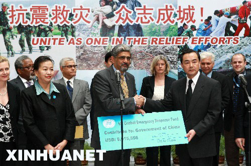 聯(lián)合國駐華系統(tǒng)協(xié)調(diào)員馬和勵在捐贈儀式上表示,四川地震災(zāi)害發(fā)生后,中國政府救災(zāi)工作的規(guī)模之大、速度之快令世人贊嘆。聯(lián)合國愿為中國的救災(zāi)工作提供任何形式的幫助,并愿積極協(xié)助中方進行災(zāi)后重建。