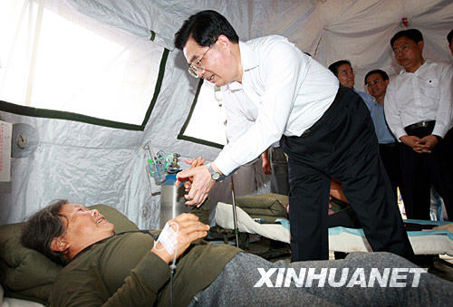 5月31日,中共中央總書記、國家主席、中央軍委主席胡錦濤前往陜西地震重災(zāi)區(qū)漢中市,察看災(zāi)情,指導(dǎo)抗震救災(zāi)工作。這是胡錦濤在寧強(qiáng)縣廣坪鎮(zhèn)金山寺村,看望正在救災(zāi)帳篷內(nèi)接受治療的受傷村民。 新華社記者鞠鵬攝