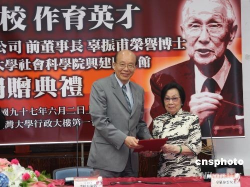 六月二日,辜振甫的遺孀辜嚴倬云替他完成遺愿,捐贈臺灣大學社會科學院興建圖書館。圖為臺灣大學校長李嗣涔向辜嚴倬云致贈感謝狀。 中新社發(fā) 耿軍 攝