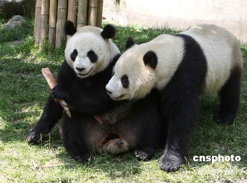 5月23日,準(zhǔn)備贈(zèng)送臺(tái)灣的大熊貓團(tuán)團(tuán)(右)和圓圓,在四川汶川大地震后的臥龍大熊貓保護(hù)區(qū)內(nèi)無憂無慮地戲耍。 中新社發(fā) 任晨鳴 攝