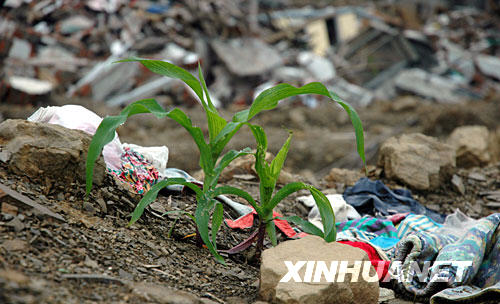 北川縣城廢墟上已經(jīng)長出玉米苗(6月16日攝)。 新華社記者 王洋 攝