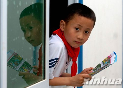 在都江堰市幸福家園安置點(diǎn),小學(xué)生鄧煜銳從活動(dòng)板房內(nèi)探出身來 新華網(wǎng)記者 岳月偉 攝