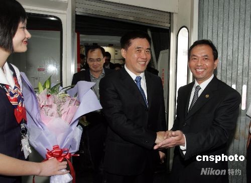 6月23日下午,臺(tái)北市長郝龍斌抵達(dá)上海浦東國際機(jī)場(chǎng),開始對(duì)上海進(jìn)行為期5天的訪問,這是新中國成立以來,臺(tái)北市長首次訪問上海。圖為上海市臺(tái)辦主任楊建榮(右)到機(jī)場(chǎng)迎接。 中新社發(fā) 潘索菲 攝