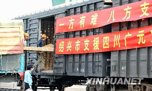5月22日,一批救災(zāi)帳篷在浙江上虞火車站裝車,準(zhǔn)備運(yùn)往四川省廣元市。新華社發(fā)(袁云 攝)