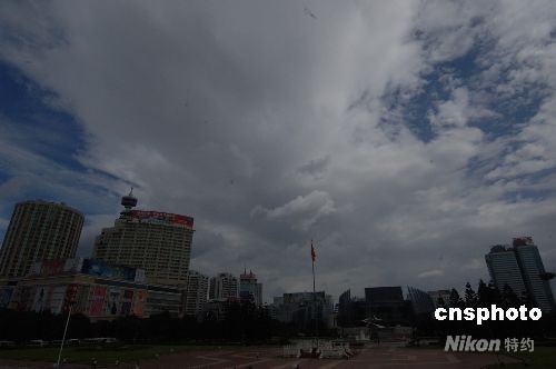 7月27日,福建省氣象臺發(fā)布臺風(fēng)黃色預(yù)警信號:福建省沿海臺風(fēng)警報。 臺風(fēng)"鳳凰"11時中心位于臺灣臺東縣偏東方約350公里洋面上,近中心最大風(fēng)力13級(風(fēng)速38米/秒)。未來繼續(xù)向偏西方向移動,將于28日早晨到中午在臺灣花蓮到臺東之間沿海登陸,然后向福建省中部沿?拷。圖為當(dāng)日下午福州上空云層變化多端。 中新社發(fā) 劉可耕 攝