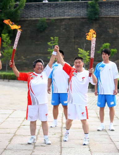 7月30日,火炬手孫剛(右)與下一棒火炬手林秀貞交接后展示火炬。當(dāng)日,北京奧運(yùn)圣火在河北省秦皇島市傳遞。新華社記者 邢廣利 攝