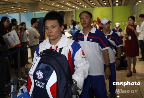 中新網(wǎng)7月31日電 7月31日,中華臺北隊舉重運動員抵達北京首都國際機場。參加北京奧運會的中華臺北舉重隊由7人組成,包括5名運動員和2名教練員。
