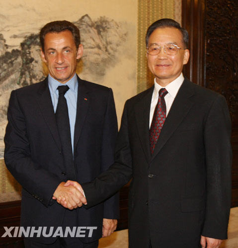 在會見法國總統(tǒng)薩科齊時,溫家寶說,法國是中國在歐盟的重要伙伴。薩科齊總統(tǒng)最近表達了對中國人民的良好祝愿和致力于推動中法全面戰(zhàn)略伙伴關(guān)系發(fā)展的愿望,我們表示贊賞。中方珍惜兩國和兩國人民之間的合作與友誼,希望中法關(guān)系的全面性、戰(zhàn)略性和長期性能夠保持下去。我們愿與法方加強磋商與協(xié)調(diào),推動第十一次中歐領(lǐng)導人會晤和第七屆亞歐首腦會議取得積極成果,促進中歐關(guān)系和亞歐關(guān)系深入發(fā)展。
