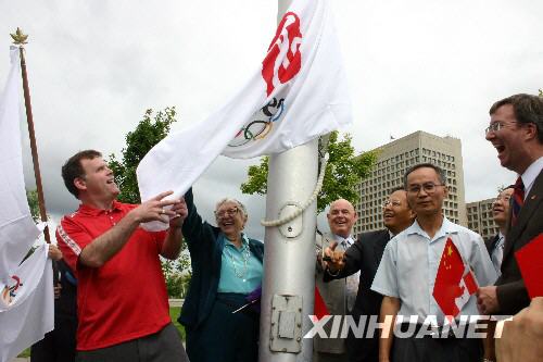 8月8日,加拿大聯(lián)邦環(huán)境部長貝爾德(左一)、中國駐加大使蘭立。ㄗ笏模┰阡滋A共同升起北京奧運會會旗。當(dāng)天,加拿大渥太華市政府與當(dāng)?shù)厝A人華僑社團聯(lián)合舉行北京奧運會會旗升旗儀式,慶祝北京奧運會開幕。 新華社記者楊士龍攝