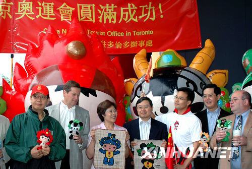 8月8日,在加拿大多倫多,中國駐多倫多總領(lǐng)事朱桃英(左三)與華人華僑、加拿大友人共慶北京奧運會開幕。新華社發(fā)
