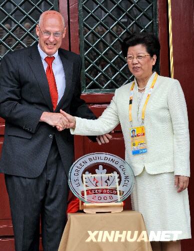 新華網(wǎng)北京8月13日奧運專電(記者汪涌)美國財政部長保爾森13日專程來到北京奧運村,代表美國綠色建筑協(xié)會為北京奧運村頒發(fā)綠色環(huán)保金獎“能源與環(huán)境設(shè)計先鋒金獎”。