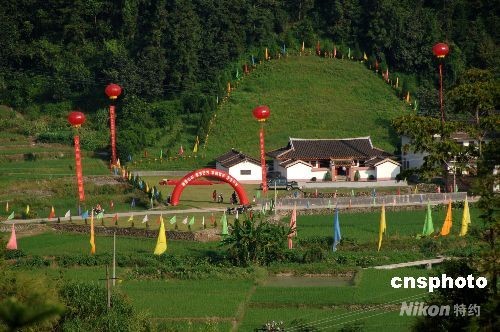 八月十三日,中國(guó)國(guó)民黨主席吳伯雄祖籍地--福建永定縣下洋鎮(zhèn)思賢村里的吳氏宗祠周邊,彩旗、彩球、條幅飄揚(yáng),喜氣洋洋,等候吳伯雄第二次回鄉(xiāng)謁祖。繼二000年十一月首次祭祖后,吳伯雄一行十四日上午將再次回到思賢村謁祖。 中新社發(fā) 鄭祚聲 攝