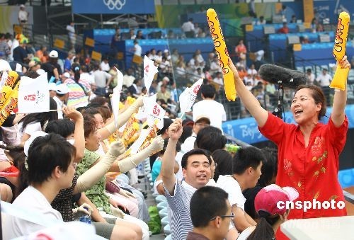 8月13日,2008北京奧運(yùn)棒球賽在五棵松體育中心舉行,北京球迷拿著加油棒大聲喊“中華臺(tái)北加油”。 中新社發(fā) CNAsports 攝
