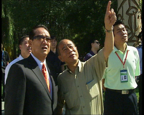 8月16日上午,宋楚瑜在北京朝陽(yáng)公園參觀由臺(tái)灣著名藝術(shù)家吳炫三創(chuàng)作的“我們都是一家人--都會(huì)叢林 綠色奧運(yùn)”雕塑藝術(shù)展。圖為吳炫三在為宋楚瑜講解自己的作品。