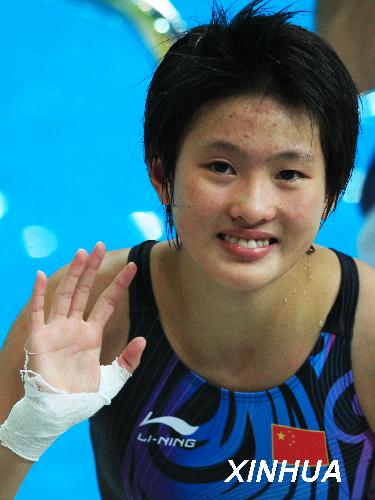 8月21日,中國選手陳若琳在比賽中向觀眾揮手致意。當(dāng)日,北京奧運(yùn)會(huì)跳水比賽在國家游泳中心——“水立方”繼續(xù)進(jìn)行,陳若琳在女子10米跳臺(tái)決賽中以447.70分的總成績奪得金牌。新華社記者劉宇攝