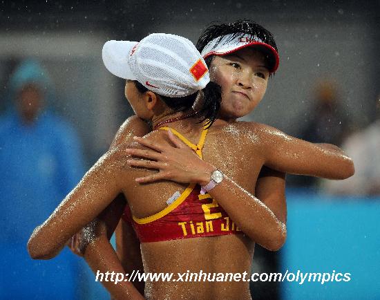 8月21日,中國選手王潔(后)/田佳擁抱慶勝利。當(dāng)日,在北京奧運(yùn)會(huì)沙灘排球女子冠亞軍決賽中,中國選手王潔/田佳以0比2負(fù)于美國選手克麗·沃爾什/米絲蒂·梅-特雷納,獲得亞軍。 新華社記者沙達(dá)提攝