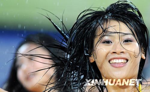 8月21日,沙灘寶貝比賽間隙在雨中激情表演。當(dāng)日,北京奧運會沙灘排球女子冠軍爭奪戰(zhàn)和3-4名決賽在朝陽公園沙灘排球場舉行。新華社記者格桑達(dá)瓦攝
