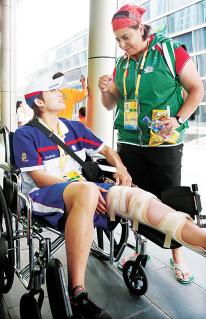 蘇麗文(左)準(zhǔn)備坐輪椅參加閉幕式