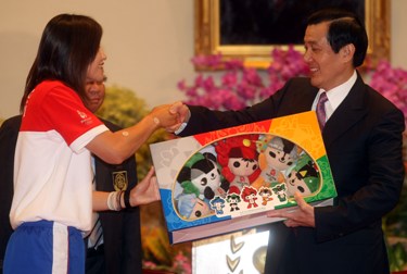 8月26日,中華臺北奧運代表團掌旗官(旗手)賴圣蓉(左)贈送北京奧運福娃給馬英九。(“中央社”圖)