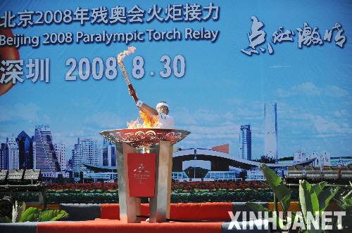 。冈拢常叭眨瑲垔W圣火“時(shí)代風(fēng)采線”第一站深圳傳遞,“點(diǎn)燃激情,傳遞關(guān)愛(ài)”、“殘奧圣火走神州,自強(qiáng)關(guān)愛(ài)耀中華”的標(biāo)語(yǔ)遍布起點(diǎn)、沿途和終點(diǎn)。