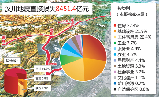 9月4日上午10時(shí),國家汶川地震專家委員會(huì)副主任、北京師范大學(xué)常務(wù)副校長(zhǎng)史培軍在國務(wù)院新聞辦公室舉行的發(fā)布會(huì)上沉痛地說,汶川地震造成直接經(jīng)濟(jì)損失8451.4億元,其中四川的損失占到總損失的91.3%,甘肅占5.8%,陜西占2.9%。