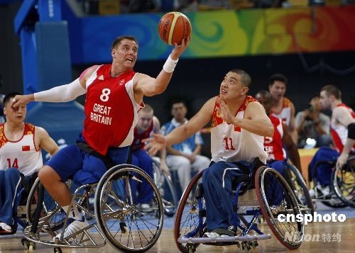 9月7日,北京殘奧會(huì)輪椅籃球比賽在北京國家體育館舉行,中國隊(duì)以34比81的比分不敵英國隊(duì)。圖為中國隊(duì)11號(hào)選手曲煥健與英國8號(hào)選手西蒙-芒恩激烈爭球。 中新社發(fā) 杜洋 攝