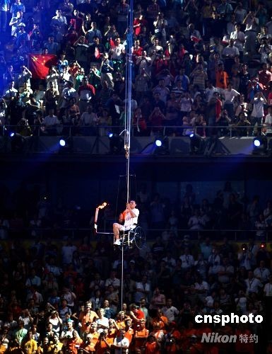 9月6日晚,北京2008殘奧會(huì)開幕式在國家體育場“鳥巢”舉行。在萬眾矚目下,殘奧會(huì)田徑金牌獲得者、火炬手侯斌,坐輪椅拉繩索攀升去點(diǎn)燃鳥巢上方的北京殘奧會(huì)主火炬。 中新社發(fā) 宋吉河 攝