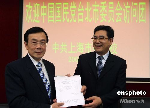 9月16日,中共上海市委黨校首次接待中國國民黨臺(tái)北市委員會(huì)訪問團(tuán)。訪問團(tuán)對這所培養(yǎng)干部的學(xué)校非常感興趣,主動(dòng)要求該校披露培訓(xùn)局級干部的課程綱要。圖為該校副校長呂貴(右)向訪問團(tuán)團(tuán)長潘家森贈(zèng)送“課程綱要”。 中新社發(fā) 潘索菲 攝