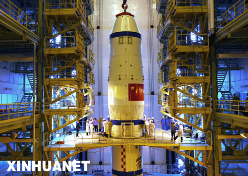 近日,神舟七號飛船完成與長征二號F運載火箭的對接。這是神舟七號飛船與長征二號F運載火箭在垂直裝配廠房進行對接。新華社發(fā)(秦憲安 攝)