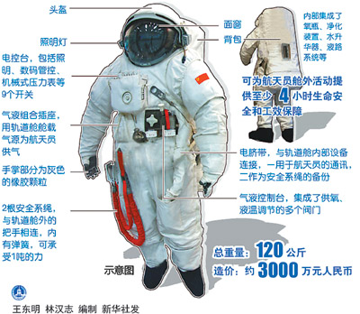 11時(shí)20分,神舟七號(hào)進(jìn)入遠(yuǎn)望三號(hào)船測(cè)控區(qū)域時(shí),航天員向地面報(bào)告了“飛天”艙外航天服啟封情況。之后,他們將進(jìn)行“飛天”艙外航天服可更換部組件的安裝。航天員翟志剛在劉伯明協(xié)助下,先后將空氣凈化器、氧瓶、電池組、無線遙測(cè)裝置等7種“飛天”艙外航天服可更換部組件進(jìn)行安裝。