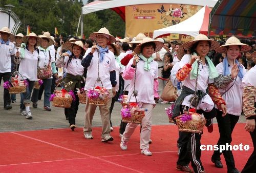 臺(tái)北客家人的狂歡節(jié)——二00八臺(tái)北客家義民嘉年華活動(dòng),于十月十一、十二日在臺(tái)北舉行。該活動(dòng)以“義民爺”祭典為主軸,附設(shè)優(yōu)質(zhì)客莊博覽會(huì)、客家文化展、客家十八般才藝決賽等項(xiàng)目,就像一場(chǎng)客家文化的盛宴,引得民眾把足球場(chǎng)大小的場(chǎng)地圍得里外幾層。圖為富有特色的“挑擔(dān)奉飯”場(chǎng)面。 中新社發(fā) 楊旭 攝