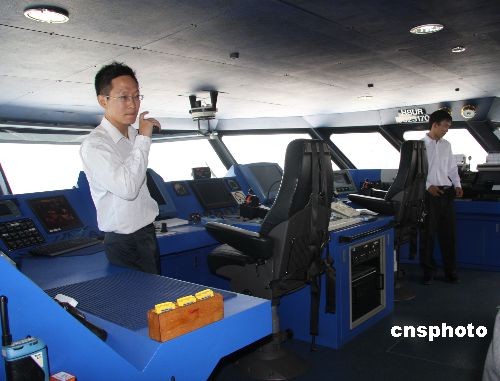 臺(tái)灣前海基會(huì)秘書長焦仁和任董事長的華達(dá)國際海運(yùn)公司新購置的“海洋拉拉號(hào)”客貨船十五日舉行首航典禮。圖為“海洋拉拉”號(hào)的駕駛艙十五日向貴賓開放參觀。 中新社發(fā) 耿軍 攝