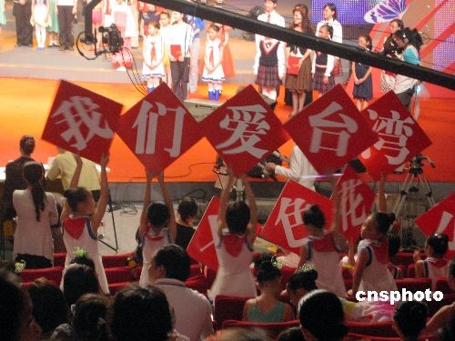 10月18日晚,上海首次舉辦“我愛臺灣”中小學(xué)生歌舞大賽。比賽由上海市臺辦、浦江之聲廣播電臺等聯(lián)合舉辦。在大賽現(xiàn)場,由兩岸小演員組成的上海七色花小學(xué)參賽隊自發(fā)打出“我們愛臺灣”的標(biāo)語。據(jù)了解,上海有超過六千名注冊在讀的臺灣籍學(xué)子,他們中的一部分也參加了這一歌舞大賽。 中新社發(fā) 許曉青 攝