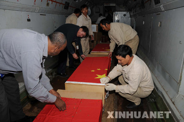 10月28日晚,3名遇害中國工人的棺材被抬下飛機(jī)之前,工作人員給棺材蓋上中國國旗。當(dāng)晚,在蘇丹西南部地區(qū)被綁匪殘忍殺害的3名中國工人的遺體被專機(jī)運(yùn)到喀土穆。新華社記者邵杰攝