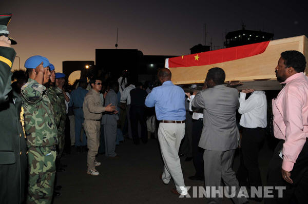 中國駐蘇丹大使館在喀土穆機(jī)場(chǎng)舉行了悼念儀式。蘇丹外交部次長(zhǎng)薩迪克等蘇丹政府官員、中國駐蘇丹大使李成文、使館工作人員、中國石油天然氣集團(tuán)公司負(fù)責(zé)人、中國駐蘇丹維和人員代表和在蘇中資機(jī)構(gòu)代表及蘇丹友好人士共100多人出席了儀式。