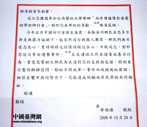 臺(tái)灣彰化縣縣長(zhǎng)卓伯源寫給張銘清副會(huì)長(zhǎng)的慰問信。信中說:今年五月中國四川省發(fā)生強(qiáng)震,本縣溪州鄉(xiāng)民在您多方奔走與鼎力協(xié)助下,能安然返臺(tái)與親人團(tuán)聚,鄉(xiāng)民們無不感念在心,更時(shí)時(shí)將這份情誼銘記在心,不敢或忘。對(duì)于您這次參訪遇襲事件,伯源至感遺憾之外并譴責(zé)此暴力行為……(詳全文)(來源:中國臺(tái)灣網(wǎng) 田云鵬攝)