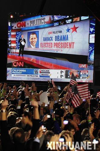新華網(wǎng)華盛頓11月4日電(記者楊晴川 嚴(yán)峰)美國(guó)各大電視網(wǎng)公布的初步統(tǒng)計(jì)結(jié)果顯示,美國(guó)民主黨總統(tǒng)候選人貝拉克·奧巴馬在4日舉行的總統(tǒng)選舉中擊敗共和黨對(duì)手約翰·麥凱恩,當(dāng)選第56屆美國(guó)總統(tǒng)。他將成為美國(guó)歷史上首位非洲裔總統(tǒng)。