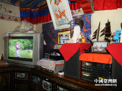家中擺著一家人去日喀則江孜旅游時在白居寺的合影,他的兒媳婦在一旁介紹,四年前家里包了一輛中巴,去江孜旅游。女婿還指指旁邊小一點的照片說:“這是去林芝拍的,我們還去內(nèi)地旅游,北京、上海都去過了。” 現(xiàn)在老人腿腳不好,不能經(jīng)常出去了,平時只能通過看電視了解外面的事,“老人喜歡看藏語電視,聽得懂,可以知道好多事,也很高興。”