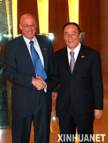 12月4日,第五次中美戰(zhàn)略經(jīng)濟對話在北京釣魚臺國賓館開幕。中國國務(wù)院副總理王岐山和美國財政部長保爾森作為兩國元首的特別代表共同主持對話。這是開幕式前,王岐山與保爾森握手。新華社記者龐興雷攝