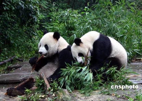 資料圖: 兩只贈(zèng)臺(tái)大熊貓“團(tuán)團(tuán)”和“圓圓”,圖為“圓圓”正在吃從“團(tuán)團(tuán)”手中搶來的竹筍。 中新社發(fā) 黃永莉 攝