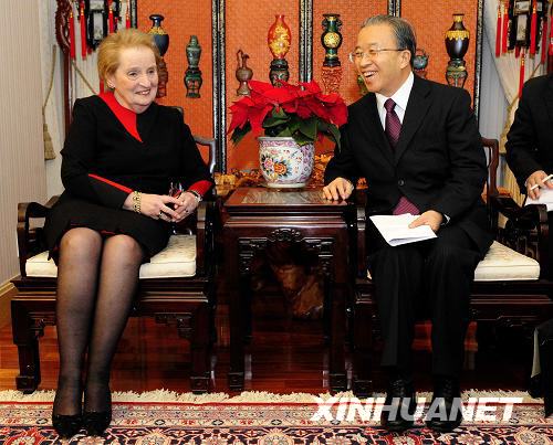 12月13日,在美國首都華盛頓,正在美國進(jìn)行工作訪問并舉行中美戰(zhàn)略對話的國務(wù)委員戴秉國(右)會見美國前國務(wù)卿奧爾布賴特。新華社記者張巖攝