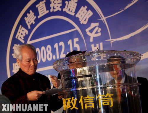 12月15日,今年81歲、出生在臺灣的鄭堅老先生在兩岸直接通郵儀式上投寄出寄往臺灣的家書。 當日,海峽兩岸直接通郵儀式在北京首都國際機場北京航空郵件交換站舉行。 新華社記者汪永基攝