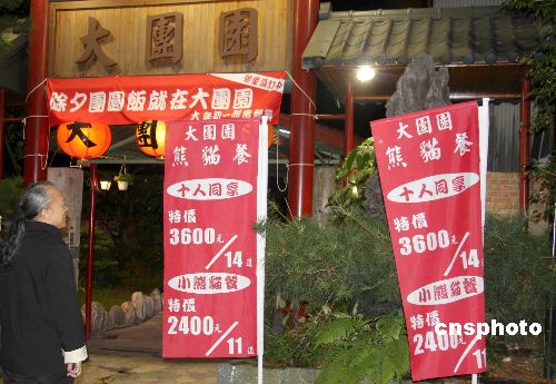 隨著大陸贈臺大熊貓團團、圓圓已經(jīng)來臺,臺灣臺北縣深坑鄉(xiāng)一家“大團圓”飯店別出心裁為春節(jié)推出的“熊貓餐”吸引顧客。 中新社發(fā) 陳立宇 攝