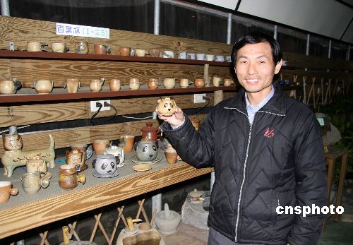 1月3日,臺北縣深坑鄉(xiāng)杯與壺博物館館長吳九巖,展示他創(chuàng)作的“熊貓杯”。 中新社發(fā) 陳立宇 攝