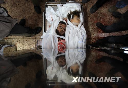 1月15日,在以軍襲擊中喪身的一對(duì)巴勒斯坦父子的尸體停放在加沙城的希法醫(yī)院。以色列軍隊(duì)對(duì)加沙地帶發(fā)動(dòng)的“鑄鉛行動(dòng)”15日進(jìn)入第20天。加沙地帶巴勒斯坦急救部門說,以軍當(dāng)天凌晨開始從加沙城南部向市中心推進(jìn),至當(dāng)天上午,有約30名巴勒斯坦人喪生,以軍對(duì)加沙地帶的軍事打擊造成的死亡人數(shù)已升至1060人。新華社記者納賽爾攝