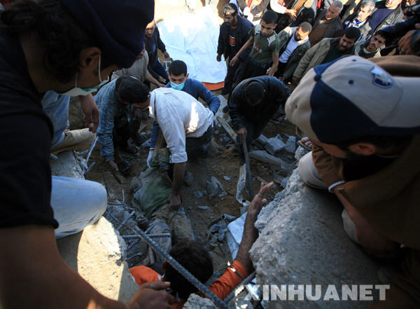 1月18日,在加沙城東部,巴勒斯坦人從廢墟中挖出一名遇難兒童的遺體。以色列總理奧爾默特當(dāng)日說,盡管以方已在加沙地帶實施單邊停火,但如果巴勒斯坦有關(guān)武裝派別不停止火箭彈襲擊,以方有權(quán)重新展開軍事行動。新華社記者納賽爾攝