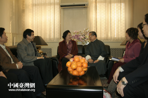 昨天,臺盟中央主席林文漪與臺盟中央副主席黃志賢一行來到位于北京豐臺區(qū)的育青食品開發(fā)有限公司,為在京臺商代表送上節(jié)日祝福,并與臺商們按照臺灣的過年習俗,品嘗了帶有濃郁家鄉(xiāng)風味的棗茶和點心。
