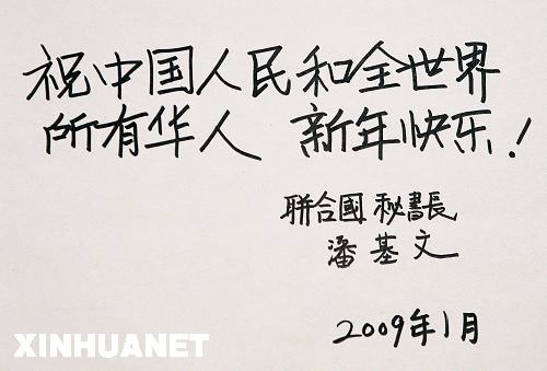 在中國(guó)農(nóng)歷新年即將到來(lái)之際,聯(lián)合國(guó)秘書(shū)長(zhǎng)潘基文通過(guò)新華社發(fā)表用漢字親筆書(shū)寫(xiě)的祝詞:“祝中國(guó)人民和全世界所有華人新年快樂(lè)!”。(2009年1月23日攝于美國(guó)紐約聯(lián)合國(guó)總部)新華社記者侯俊攝