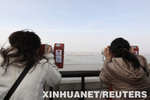 1月30日,在靠近韓朝邊界韓國(guó)北部京畿道坡州市,兩名游客用望遠(yuǎn)鏡向朝鮮方向觀望。新華社/路透