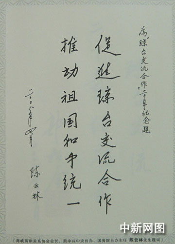 《聚焦姊妹島—瓊臺交流合作20年》封樣。 王辛莉 攝陳云林題詞。 王辛莉 攝